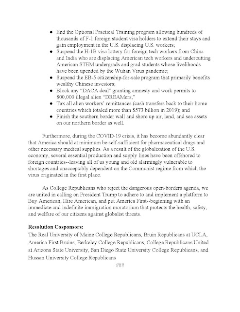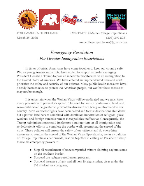 AMEN AMEN AMEN: New alliance of nationalist College Republicans calls for immediate immigration moratorium to protect safety, security & economic well-being of #AmericaFirst! Do @yaf & @TPUSA (and their donors) support or oppose this common-sense resolution? https://t.co/JdVaG9Bawq — Michelle Malkin (@michellemalkin) March 25, 2020